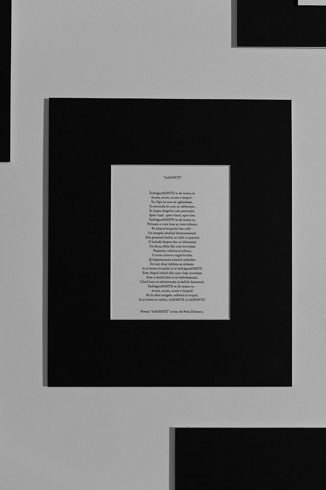Expozitia este centrata in jurul poeziei IubESHTE scrisa de Nela Dinescu.